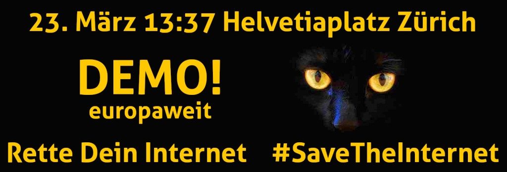 Mächtige Lobby-Organisationen wollen in der Schweiz und in der EU ein Urheberrecht schaffen, das das Internet und die Netzkultur massiv in Mitleidenschaft ziehen würde. Wir müssen nun den Protest auf die Strasse bringen! Zeigen wir den Politikern, dass wir nicht einverstanden sind! Zusammen mit der Allianz für ein faires Urheberrecht rufen wir auf zur Demonstration am 23. März in Zürich. In ganz Europa finden an diesem Tag Demostrationen statt – komm auch und sei Teil der Bewegung #SaveYourInter...